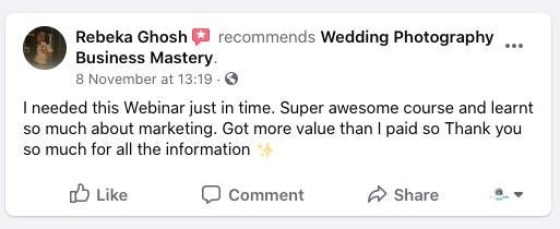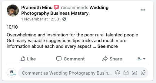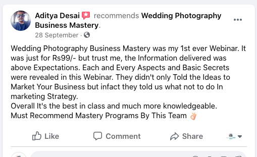 His Marketing Formula to get your own clients using the power of Social Media Optimisation and Social Media Marketing helps photographers and cinematographers to get their own clients without depending on any Online Wedding Portals like WedmeGood, WeddingWire etc to get the leads for their Business. His Marketing Formula makes people self dependent on their business.